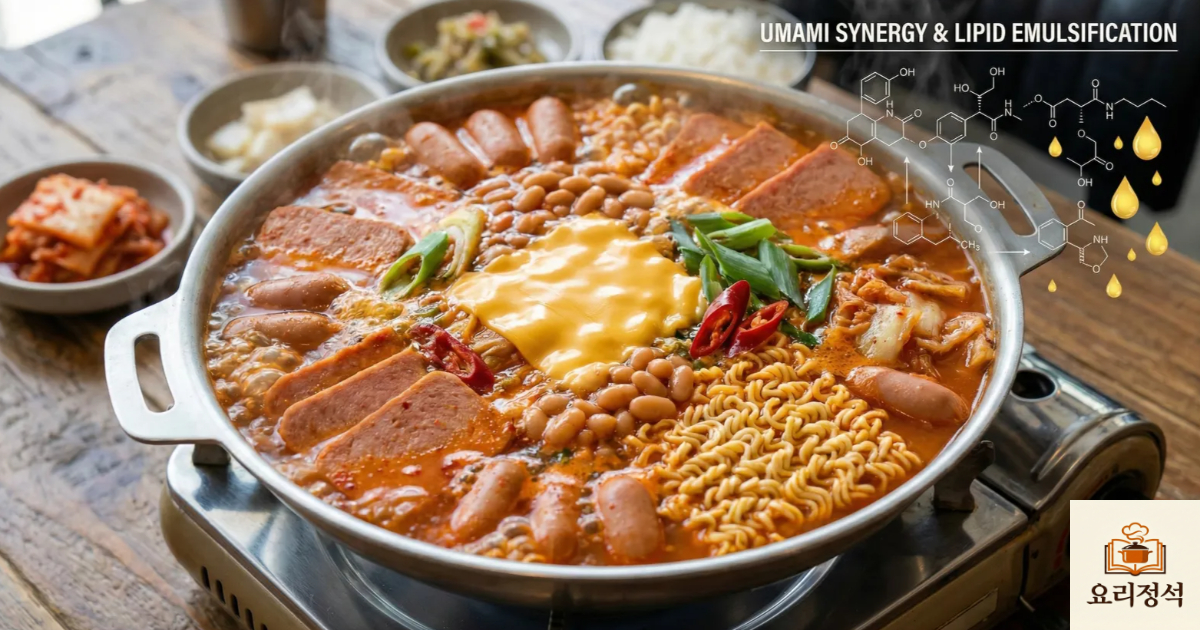 "부대찌개의 깊은 맛은 가공육의 포화지방이 지질 융해(Lipid Melting) 과정을 거쳐 국물의 염도와 만나 안정적인 유화 상태를 형성할 때 완성됩니다."