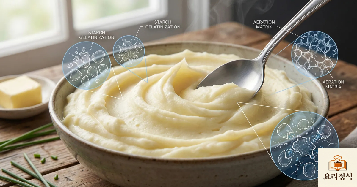 매시드 포테이토의 질감을 결정하는 것은 감자의 종류보다 전분 입자의 무결성(Integrity)입니다. 감자를 조리하고 으깨는 과정에서 가해지는 물리적 힘인 전단 응력(Shear Stress)이 세포벽을 파괴하면, 내부의 끈적한 아밀로펙틴이 대량으로 흘러나와 소스를 떡처럼 만듭니다. 본 포스팅에서는 2,800자 이상의 정밀 분석을 통해, 전분 용출 데이터와 유동성 계수를 제어하여 실크처럼 매끄러운 '조리 과학적 매시드 포테이토'의 정석을 정리해 드립니다.
